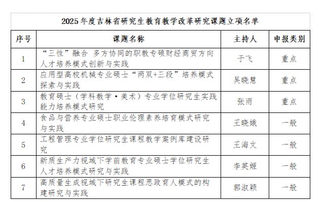 根据《关于开展2025年度吉林省研究生教育教学改革研究课题申报工作的通知》要求,经个人申报、部门推荐、学校初审把关、专家评审打分,按省教育厅限额推荐要求,我校推荐申报课题10项。经省教育厅组织专家评审,我校获立7项研究生教育教学改革研究课题,其中重点课题3项、一般课题4项。具体立项名单详见下表。