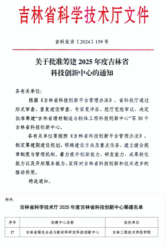 近日,吉林省科技厅印发《关于批准筹建2025年度吉林省科技创新中心的通知》,批准我校化学与工业生物工程交叉学科研究院申报的“吉林省绿色合成与新材料研发科技创新中心”作为筹建项目。此次获批是学校在省级科技创新平台建设方面取得的又一重要成果。截止目前,我校科研平台数目已突破30个,在科研平台建设方面取得了新的突破。对于推动区域科技创新、重大关键核心技术研发与应用,促进科技成果转化,服务重点支柱产业,将起到重要的支撑作用。学校将按照《吉林省科技创新平台管理办法》,做好筹建期建设规划,明确建设方向及重点任务,建立健全规章制度与管理机制,着力提升中心的创新能力、研发能力、成果转化能力以及开放服务能力,为推动吉林省科技创新和技术进步作出应有贡献。