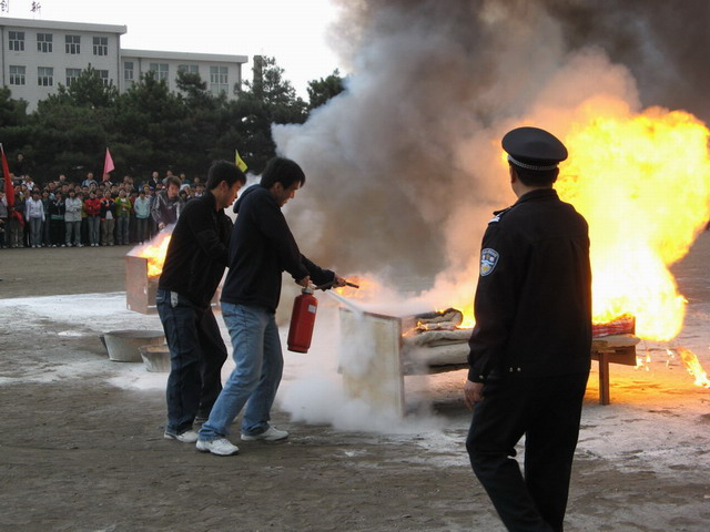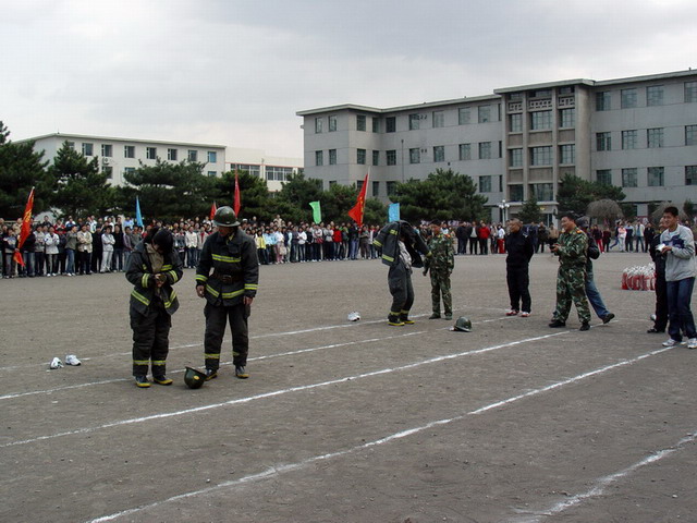 下午2时30分, 我校2007年消防演练运动会正式开始。首先,宽城区消防大队六中队的消防战士进行了灭火战斗队型演练和消防水带连接表演,接下来消防战士与我校学生义务消防队员进行了消防战斗服着装比赛,我校学生还在消防战士的指导下进行了使用干粉灭火器扑灭油槽着火和床铺着火的实战演练。消防演练活动持续了一个多小时,消防项目的设置不但有较强的趣味性,而且还具有很强的实用性,使在场师生提高了安全防火意识,掌握了消防灭火基本技能,取得了预期效果。