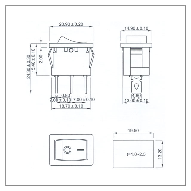 技术参数: ◆安装尺寸:19.5mm×13.2mm; ◆ 规格:20A 125VAC ; 16A 250VAC; ◆ 接触电阻:≤35mΩ; ◆ 绝缘电阻:≥100mΩ; ◆ 耐电压:1500VAC,1分钟; ◆ 操作温度:-25℃~+85℃; ◆ 电气寿命:>10000 次。