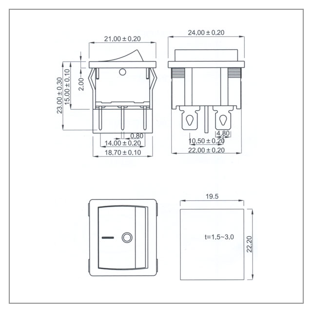 技术参数: ◆安装尺寸:19.5mm×22.2mm;T85 ◆ 规格:10A 125VAC ; 6A 250VAC; ◆ 接触电阻:≤35mΩ; ◆ 绝缘电阻:≥100mΩ; ◆ 耐电压:1500VAC,1分钟; ◆ 操作温度:-25℃~+85℃; ◆ 电气寿命:>10000 次。