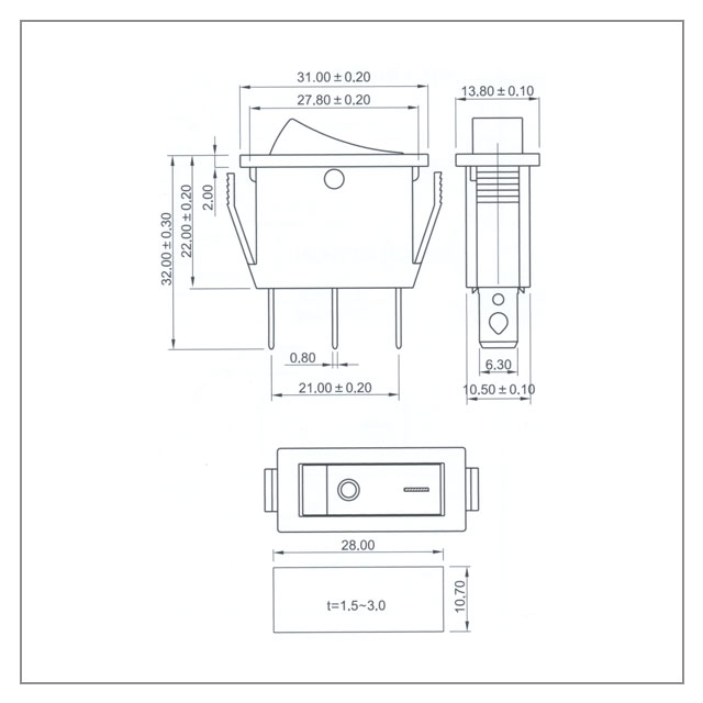 技术参数: ◆安装尺寸:28mm×10.7mm;T85 ◆ 规格:20A 125VAC ; 16A 250VAC; ◆ 接触电阻:≤35mΩ; ◆ 绝缘电阻:≥100mΩ; ◆ 耐电压:1500VAC,1分钟; ◆ 操作温度:-25℃~+85℃; ◆ 电气寿命:>10000 次。
