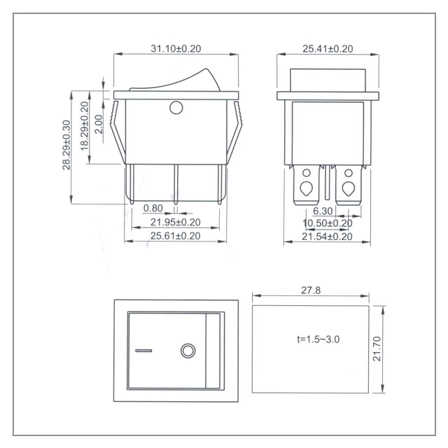 技术参数: ◆安装尺寸:27.8mm×21.7mm;T85 ◆ 规格:20A 125VAC ; 16A 250VAC; ◆ 接触电阻:≤35mΩ; ◆ 绝缘电阻:≥100mΩ; ◆ 耐电压:1500VAC,1分钟; ◆ 操作温度:-25℃~+85℃; ◆ 电气寿命:>10000 次。
