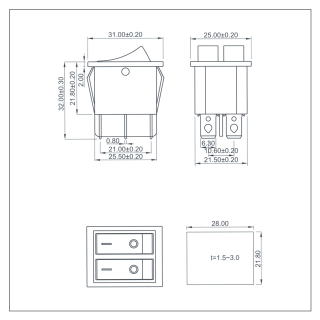 技术参数: ◆安装尺寸:28mm×21.8mm;T85 ◆ 规格:20A 125VAC ; 16A 250VAC; ◆ 接触电阻:≤35mΩ; ◆ 绝缘电阻:≥100mΩ; ◆ 耐电压:1500VAC,1分钟; ◆ 操作温度:-25℃~+85℃; ◆ 电气寿命:>10000 次。