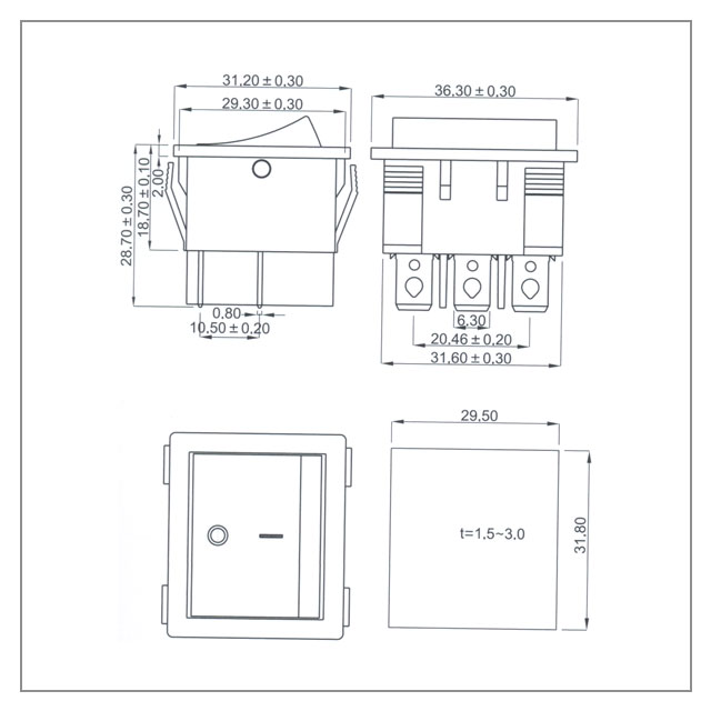 技术参数: ◆安装尺寸:29.5mm×31.8mm;T85 ◆ 规格:20A 125VAC ; 16A 250VAC; ◆ 接触电阻:≤35mΩ; ◆ 绝缘电阻:≥100mΩ; ◆ 耐电压:1500VAC,1分钟; ◆ 操作温度:-25℃~+85℃; ◆ 电气寿命:>10000 次。