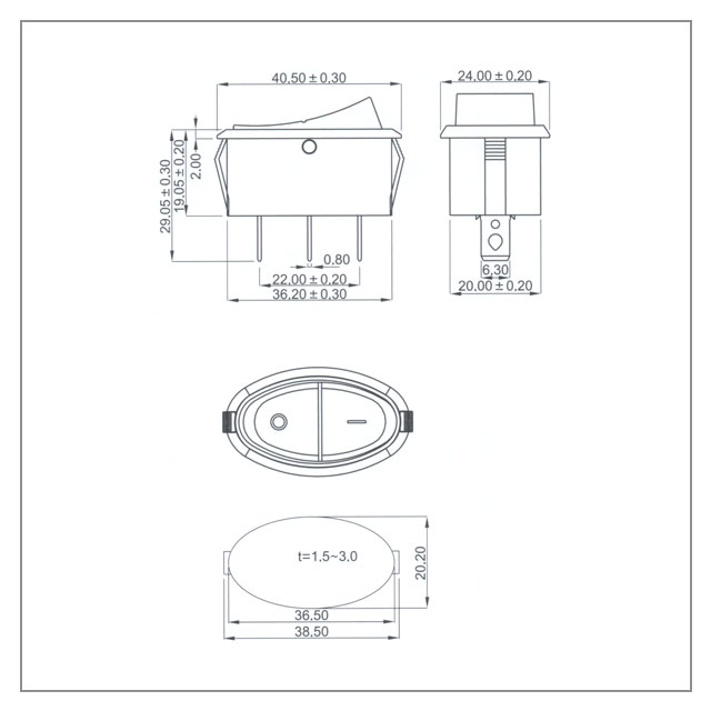 技术参数: ◆安装尺寸:35mm×20.2mm;T85 ◆ 规格:20A 125VAC ; 16A 250VAC; ◆ 接触电阻:≤35mΩ; ◆ 绝缘电阻:≥100mΩ; ◆ 耐电压:1500VAC,1分钟; ◆ 操作温度:-25℃~+85℃; ◆ 电气寿命:>10000 次。