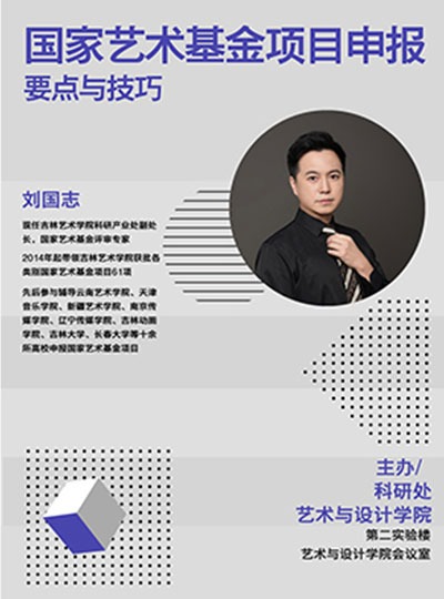 主讲人:刘国志,男,吉林艺术学院教授时间、地点:2023年4月13日,艺术与设计学院会议室主办单位:艺术与设计学院、科研处.讲座内容:1.国家艺术基金项目资助管理政策,国家艺术基金资助项目整体情况讲解;2.人才培训资助项目、传播交流推广资助项目、美术创作资助项目申报要点分析;3.答疑解惑,强调申报时需要避免的事项