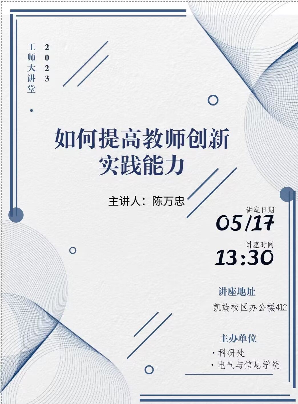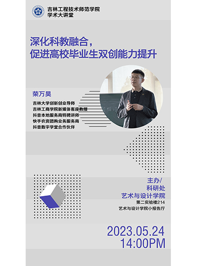 时间、地点:2023年5月24日,第二实验楼214小报告厅主办单位:艺术与设计学院、科研处讲座内容:1.科教融合的意义与价值;2.高校毕业生双创现状分析;3科教融合提升高校毕业生双创能力途径及可行性.