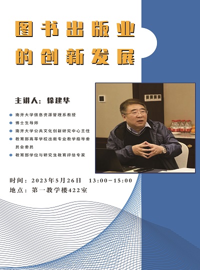 主讲人:徐建华,男,南开大学信息资源管理系教授时间、地点:2023年5月26日,第一教学楼422室主办单位:新闻与出版学院、科研处讲座内容:1.红色文献建设与推广路径;2.少年儿童的经典阅读推广;3.智慧图书馆的研究与实践.